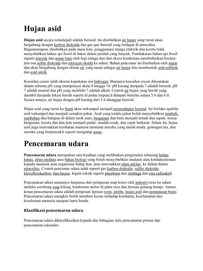 Konsep hujan asid • hujan asid ialah hujan yang mempunyai nilai ph kurang daripada 5 yang mengandungi gas sulfur dioksida dan nitrogen oksida yang terlepas di udara bercampur dengan air hujan untuk membentuk asid sulfurik dan asid nitrik.hujan asid secara semulajadi adalah berasid. Ia ditemukan tak sadarkan diri di rumahnya. Antara berikut, yang manakah gunung tertinggi di semenanjung malaysia? Jerebu di malaysia menyebabkan pelbagai kesan negatif seperti. Creating wonder the petrosains blog: