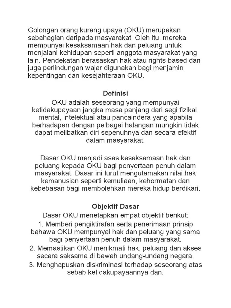 Orang kurang upaya ( oku ) dikatkrifkan sebagai indidvidu yang mempunyai kekurangan jangka panjang dari segi fizikal, mental, intelektual atau deria yang apabila berinteraksi dengan pelbagai halangan, boleh menyekat penyertaan penuh dan berkesan mereka dalam masyarakat. (akta oku 2008). Oleh itu, mereka mempunyai kesaksamaan hak dan peluang untuk menjalani kehidupan seperti anggota masyarakat yang lain. Garis panduan pendaftaran orang kurang upaya 1 kandungan bil. A) kurang upaya penglihatan buta b) kurang upaya pendengaran pekak / bisu c) kurang upaya anggota kudung / lumpuh d) kurang upaya akal 'down syndrome'/ lembam 10. Daripada jumlah tersebut, 6% boleh menyesuaikan diri dengan kekurangan mereka, 4% memerlukan.