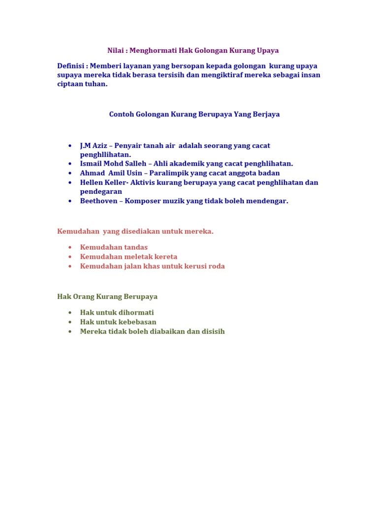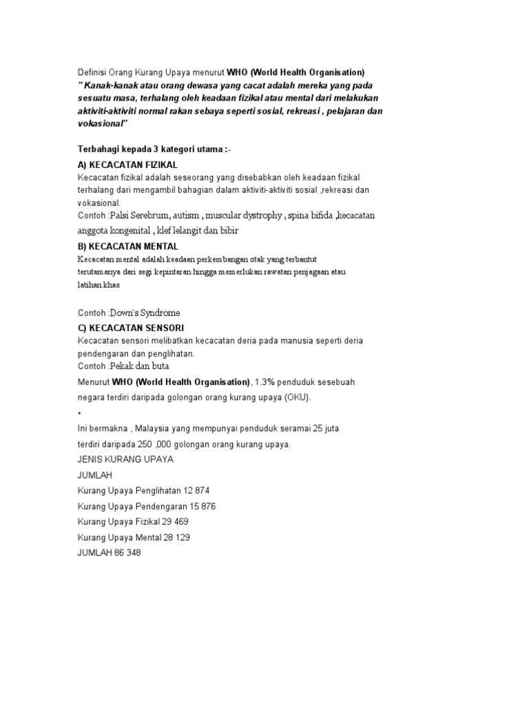 Menurut akta orang kurang upaya (oku) pada tahun 2008, definisi orang kurang upaya adalah seseorang yang mempunyai kekurangan jangka panjang dari segi fizikal, mental, intelektual atau deria yang apabila berinteraksi dengan pelbagai halangan, boleh menyekat penyertaan penuh dan berkesan mereka dalam masyarakat. Orang kurang upaya intelektual mempunyai masalah dari segi fungsi intelek dan penyesuaian kelakuan dan ia bergantung kepada tahap keterukannya. Definisi orang kurang upaya menurut. Definisi oku mengikut akta orang kurang upaya 2008, oku termasuklah mereka yang mempunyai kekurangan jangka panjang fizikal, mental, intelektual atau deria yang apabila berinteraksi dengan pelbagai halangan, boleh menyekat penyertaan penuh dan berkesan mereka dalam masyarakat. Isi rumah b40 dan golongan orang kurang menarik di kota tinggi facebook.