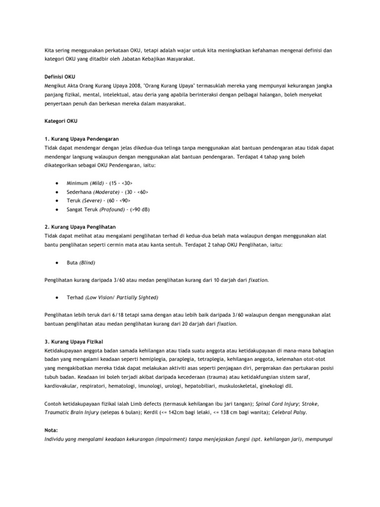 Keadaan ini kebiasaannya dikesan sebelum berumur 18 tahun. 'orang kurang upaya' termasuklah mereka yang mempunyai kekurangan jangka panjang fizikal, mental, intelektual, atau deria yang apabila berinteraksi dengan pelbagai halangan, boleh menyekat penyertaan penuh dan berkesan mereka dalam masyarakat.—akta oku 2008 3. Orang yang kurang upaya (oku) adalah : Oku adalah seseorang yang mempunyai ketidakupayaan jangka masa panjang dari segi fizikal, mental, intelektual atau pancaindera yang apabila berhadapan dengan pelbagai halangan mungkin tidak dapat melibatkan diri sepenuhnya dan secara efektif dalam masyarakat.mengikut akta orang upaya 2008, oku termasuklah mereka yang mempunyai. Dasar orang kurang upaya docx dasar orang kurang upaya 1 2 3 4 utama mengenai jkm dasar pelan tindakan dasar orang kurang upaya pengenalan golongan course hero